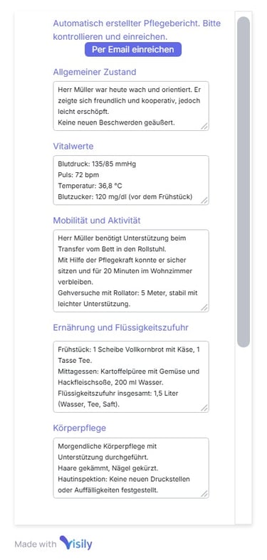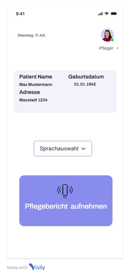 Mit unserer App sprechen Pflegekräfte eine Sprachnotiz in beliebiger Sprache ein, und unsere Technologie erstellt daraus automatisch einen strukturierten Pflegebericht