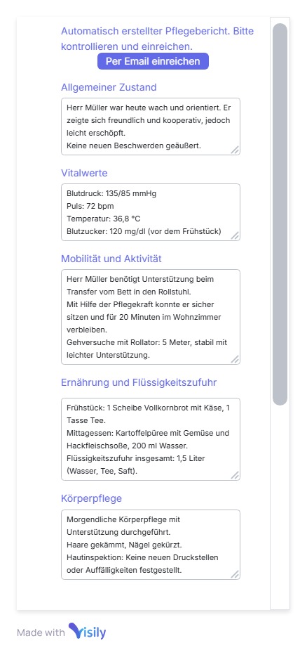 Pflegekräfte und Pflegedienste investieren wertvolle Zeit in das manuelle Ausfüllen von Pflegeberichten, und Sprachbarrieren erschweren oft eine schnelle und präzise Dokumentation.